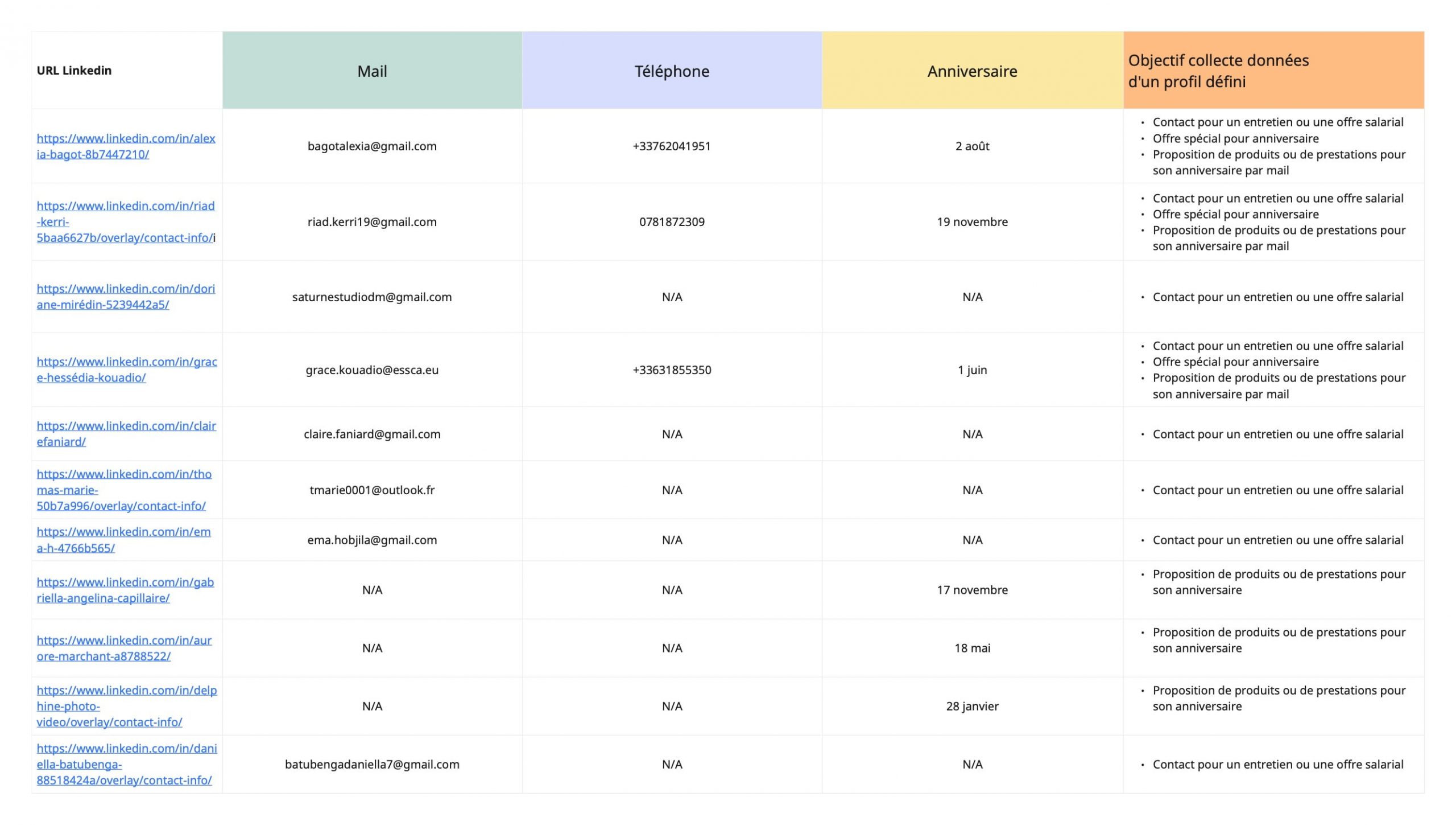 Analyser les comportements LinkedIn de profils ciblés, regardant les données disponibles (URL, mails, anniversaires etc ..)afin d’identifier les données disponibles et les actions réalisables avec ces données.